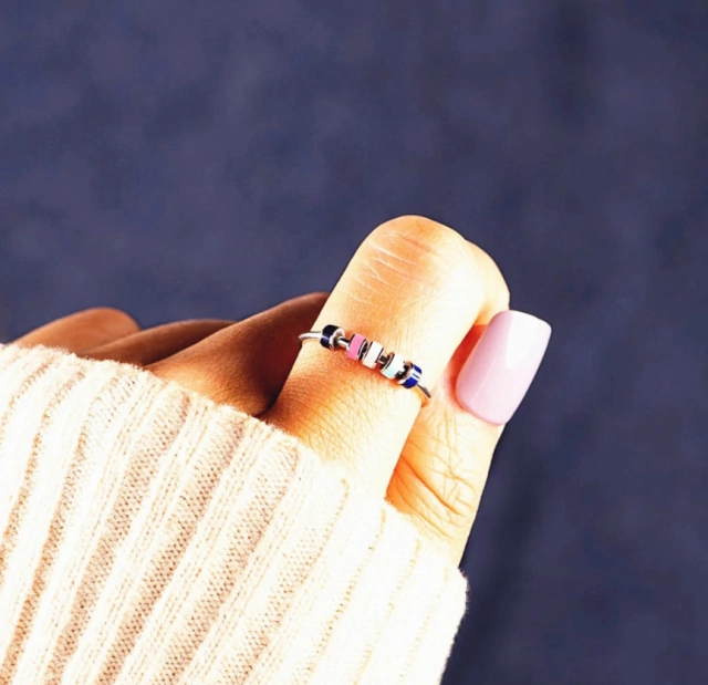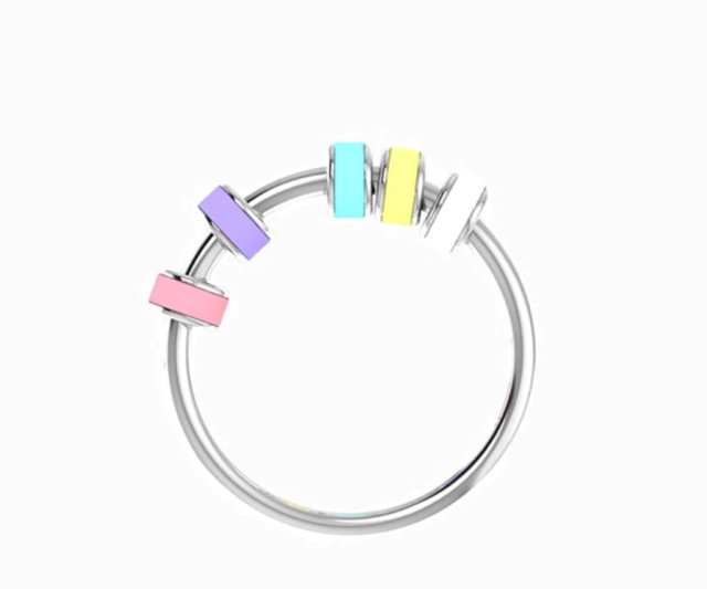 Anillo de acero inoxidable plateado con cuentas de colores ajustable anti estrés. Olvídate de la ansiedad y luce tu anillo favorito.