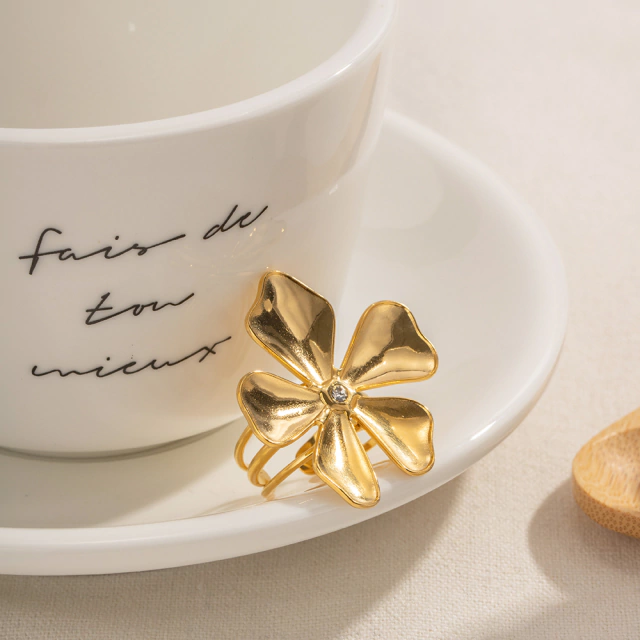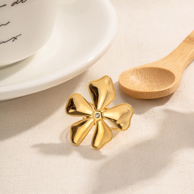 Anillo grande llamativo elegante dorado en forma de flor acero inoxidable.