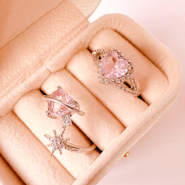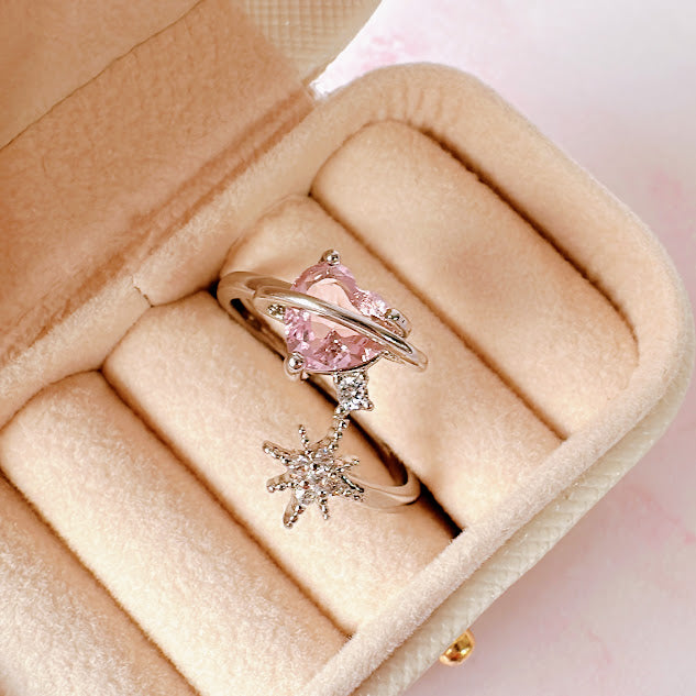 Anillo de chapa de oro de 14k de color plateado con pequeño corazón de cristal de color rosa y estrella. Su diseño atemporal y femenino lo convierte en un accesorio impresindible para ocasiones especiales o para el dia a día.