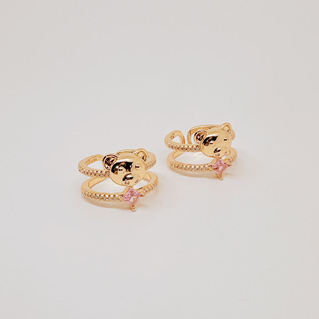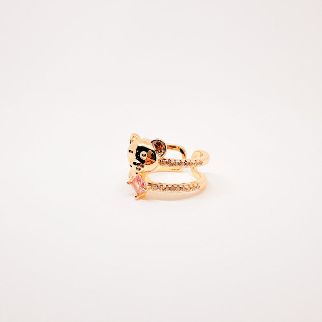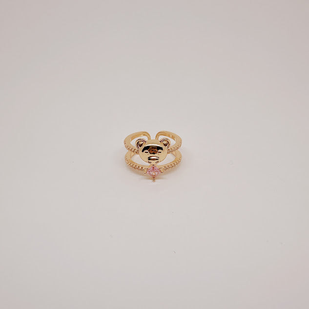 Anillo de Chapa de oro de dos niveles con forma de cara de osito y cristal rosa. Perfecto para añadir un toque de diversión y ternura a tu look.