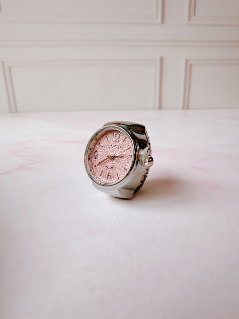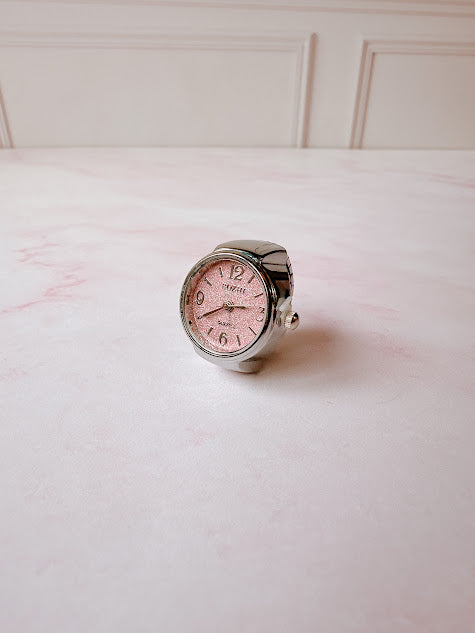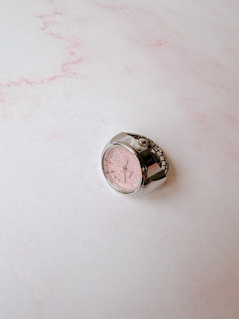 Anillo Reloj eterno glam plateado con rosa