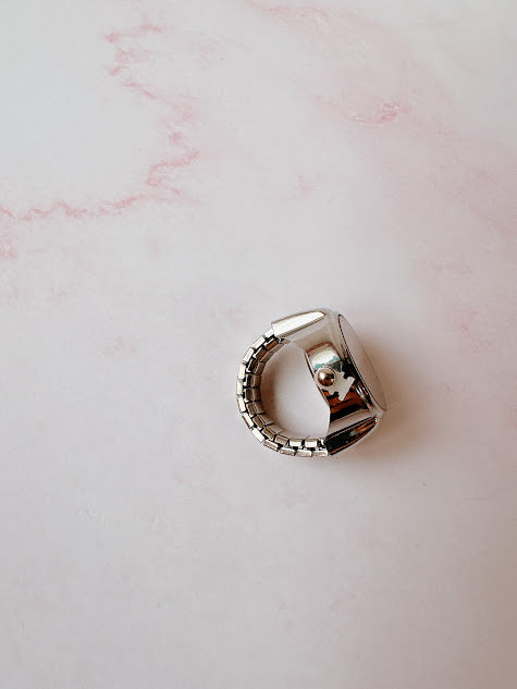 Anillo de metal con forma de reloj en color plateado, con un toque glam rosa. Añade un toque de sofisticacion y originalidad a cualquier look.