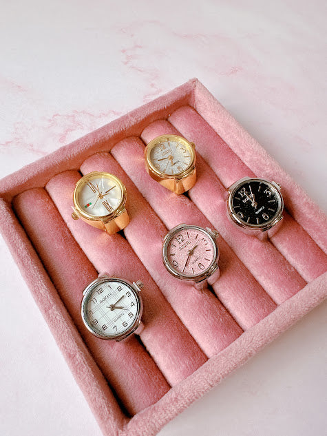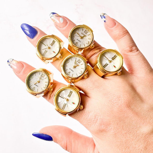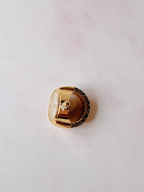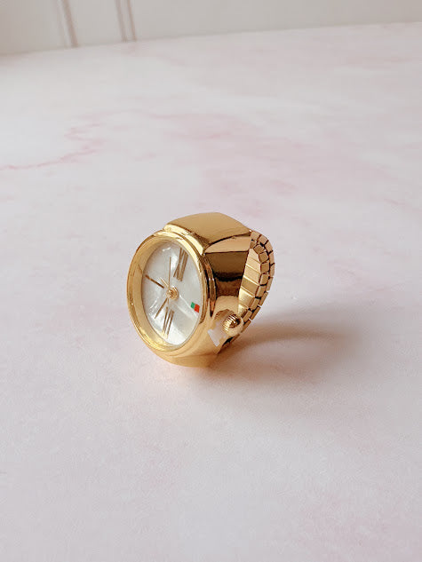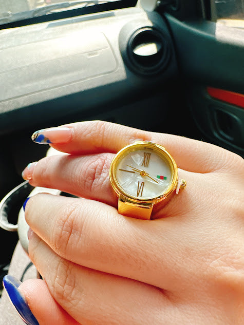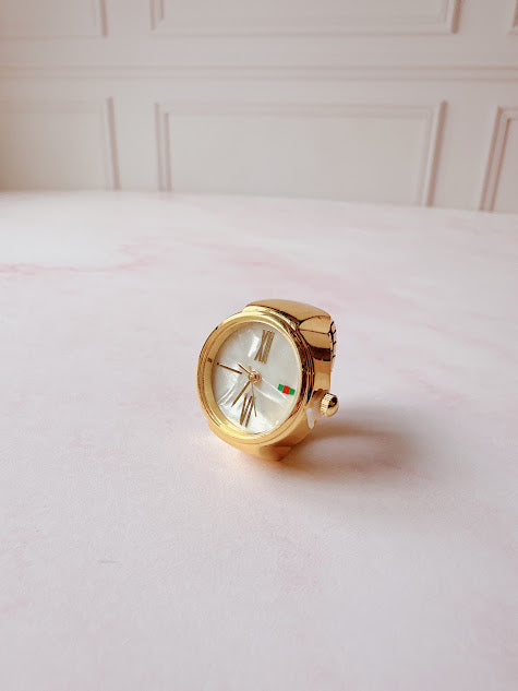 Anillo de metal con forma de reloj en color dorado, con numeros romanos . Añade un toque de sofisticacion y originalidad a cualquier look.
