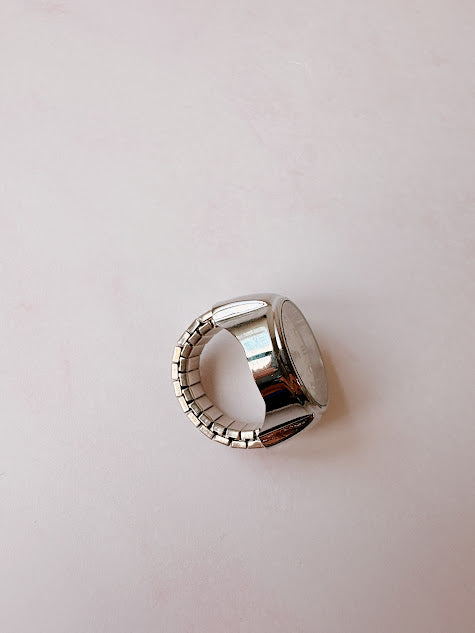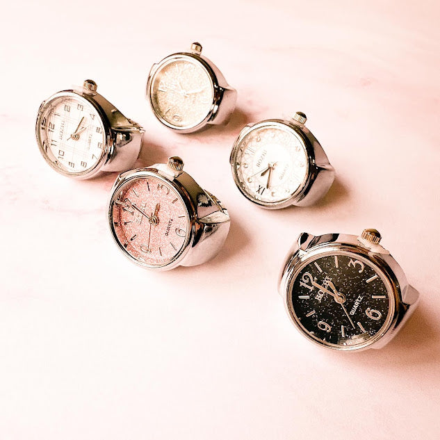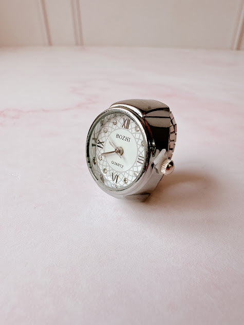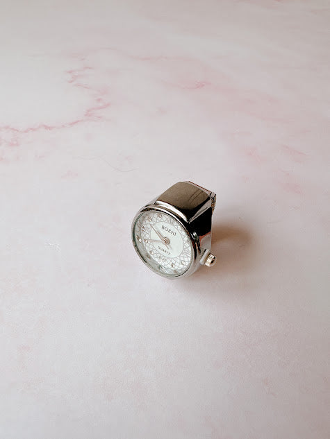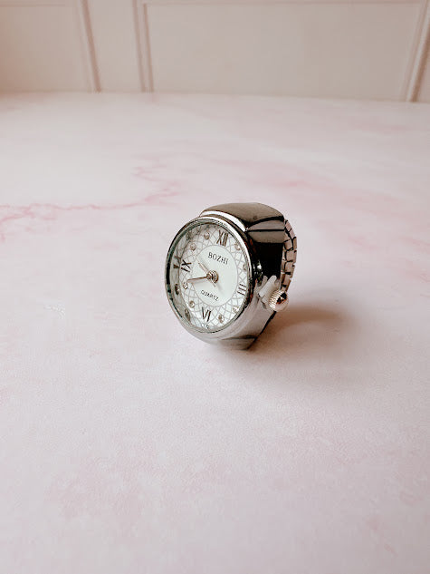 Anillo de metal con forma de reloj en color plateado, con numeros romanos y adornado con pequeños diamantitos. Añade un toque de sofisticacion y originalidad a cualquier look.