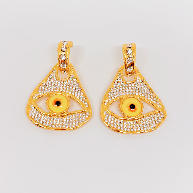 Aretes de chapa de oro dorados con forma de ojo amarillo, adornado con pequeños diamantitos. Luce estos increibles aretes diseñados para atraer todas las miradas, con cada uno de sus detalles lograrás darle un aire de misterio y sofisticación a tu look.