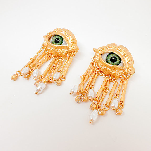 Aretes de chapa de oro dorados con forma de ojo color verde, adornado con pequeñas tiras y perlas. Luce estos increibles aretes diseñados para atraer todas las miradas, con cada uno de sus detalles lograrás darle un aire de misterio y sofisticación a tu look.