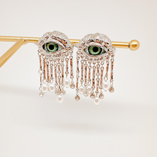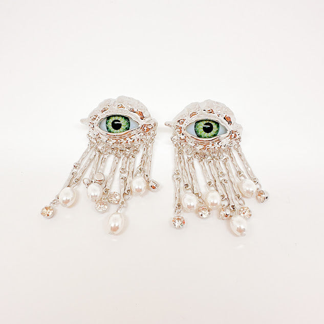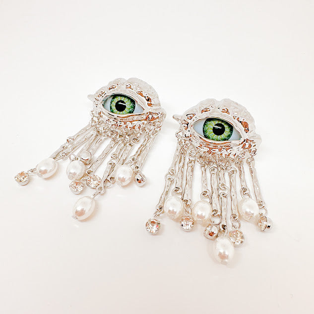 Aretes de chapa de oro plateados con forma de ojo color verde, adornado con pequeñas tiras y perlas. Luce estos increibles aretes diseñados para atraer todas las miradas, con cada uno de sus detalles lograrás darle un aire de misterio y sofisticación a tu look.