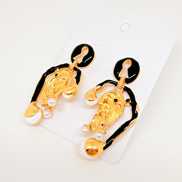 Aretes de chapa de oro dorados con forma de orejas, con detalles de color blanco y negro adornados con pequeñas perlas. Luce estos increibles aretes diseñados para atraer todas las miradas, con cada uno de sus detalles lograrás darle un aire de misterio y sofisticación a tu look.