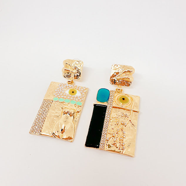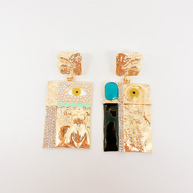 Aretes de chapa de oro dorados con forma rectangular, adornado con multiples detalles; ojo, torso de mujer y ramas con diamantitos. Luce estos increibles aretes diseñados para atraer todas las miradas, con cada uno de sus detalles lograrás darle un aire de misterio y sofisticación a tu look.
