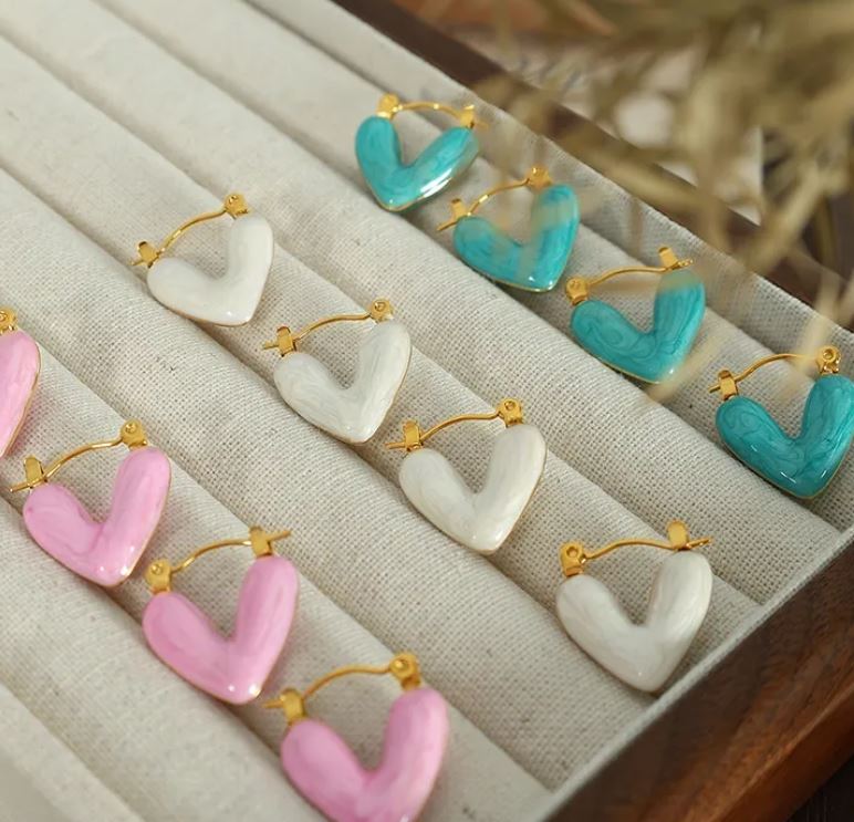 Aretes de acero de titanio chapado en oro de 18k con forma de corazón en color blanco. Su diseño atemporal y femenino los convierte en un accesorio impresindible para ocasiones especiales o para el dia a día.