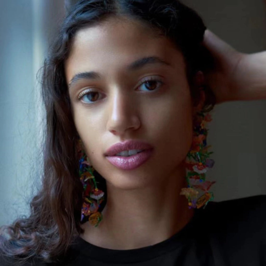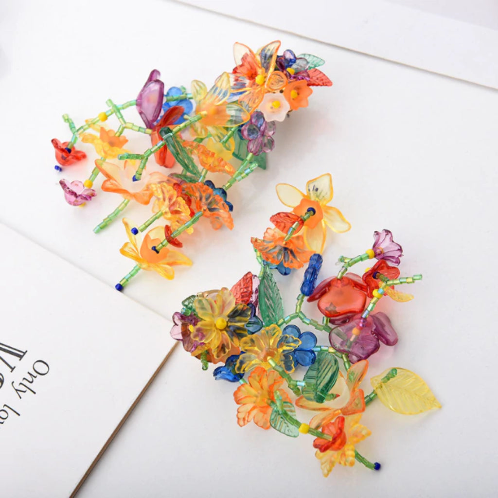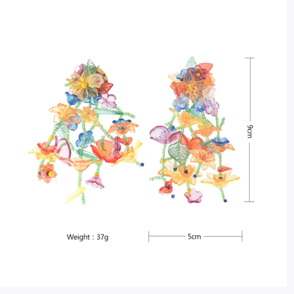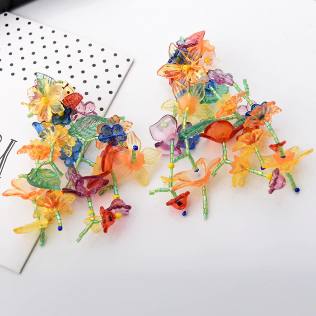 Aretes largos de florecitas colgantes bohemias multicolor de acrílico.