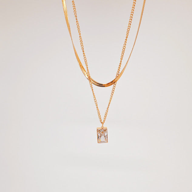 Collar doble de acero inoxidable de color dorado con dije rectangular de cristal. Eleva tu look con el toque moderno de esta pieza.