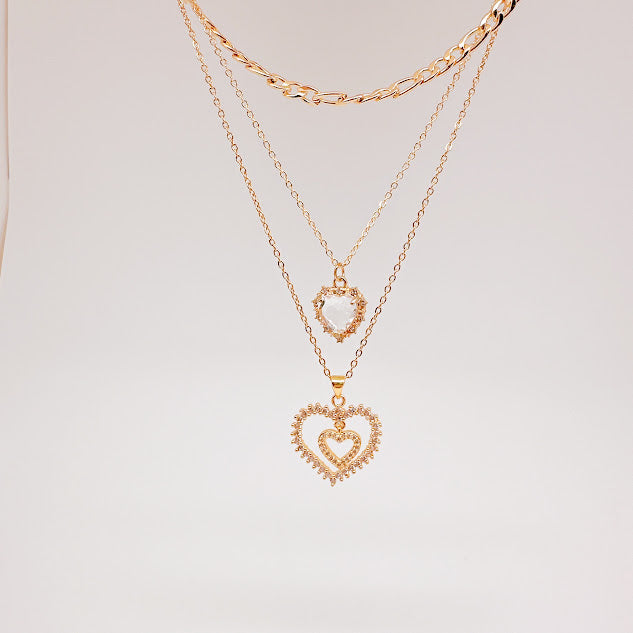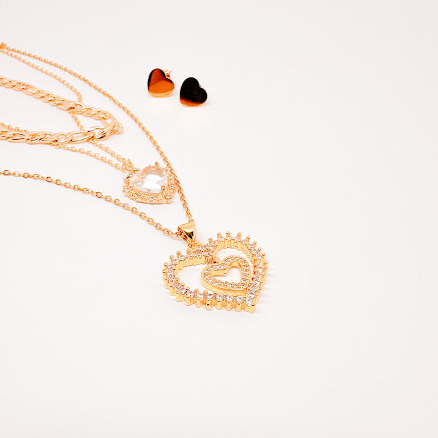 Collar de acero inoxidable de color dorado diseñado en capas adornado con multiples dijes en forma de corazon. Ideal para añadir un toque de glamour a tu atuendo diario.