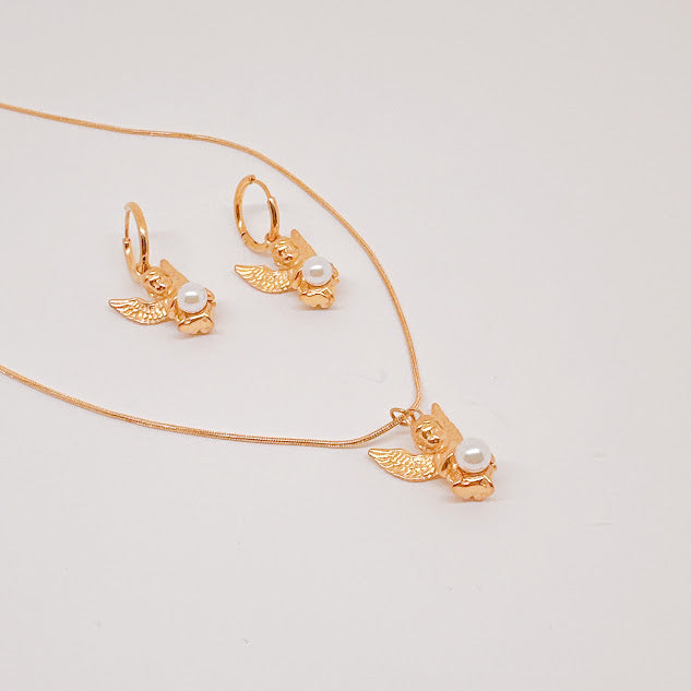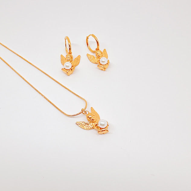 Collar de chapa de oro de 18k con dije en forma de angel adornado con una pequeña perla. Eleva tu look con la belleza atemporal de las perlas y el toque moderno de esta pieza.