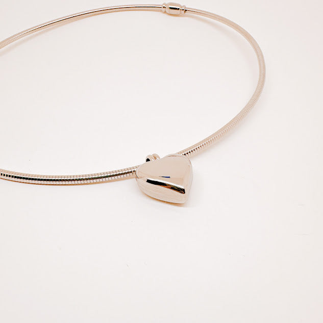 Collar tipo choker de chapa de oro de 14k adornado con un pequeño corazon color plateado. Sin duda un pieza central que elevará cualquier look, desde un look casual hasta una noche sofisticada.