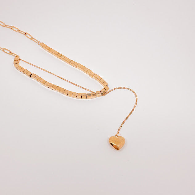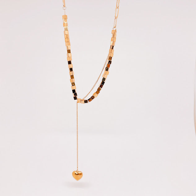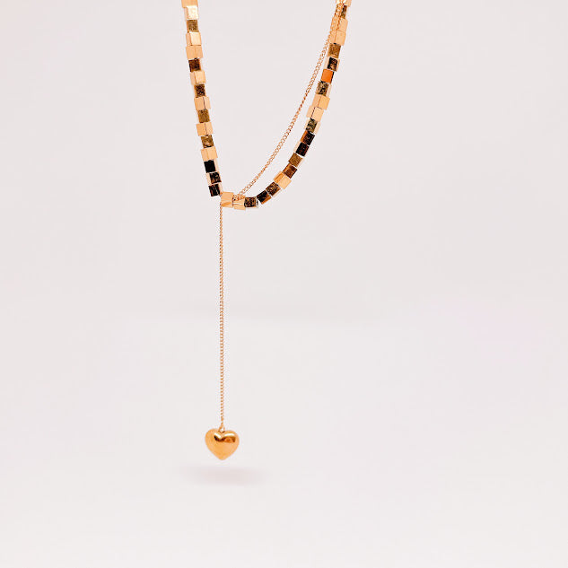 Collar de acero inoxidable de color dorado formado con pequeños cubitos y un dije de corazón colgante. Eleva tu look con el toque moderno de esta pieza.
