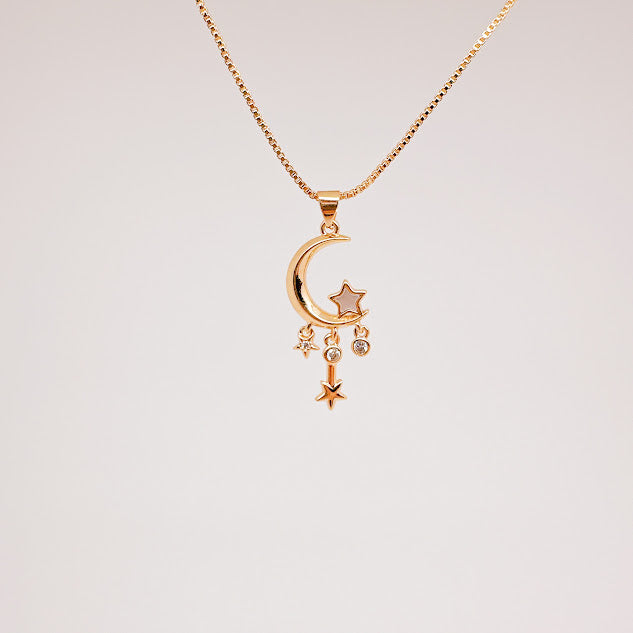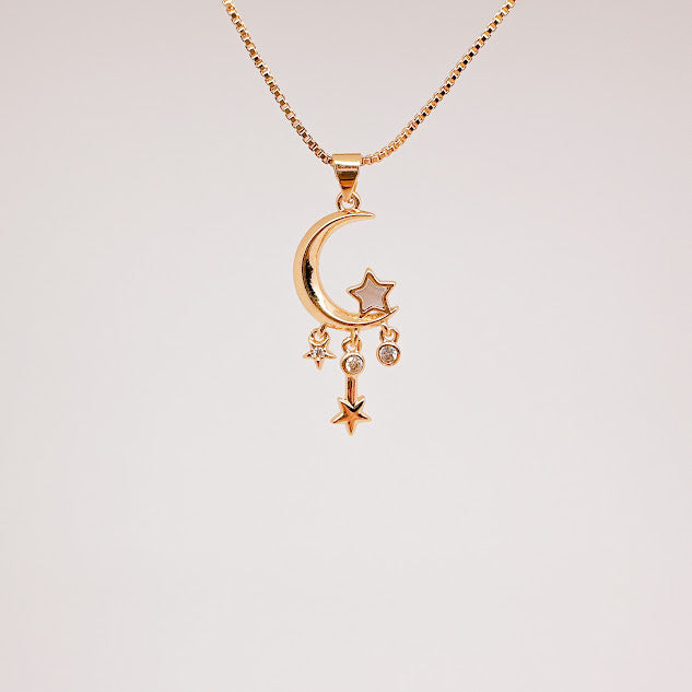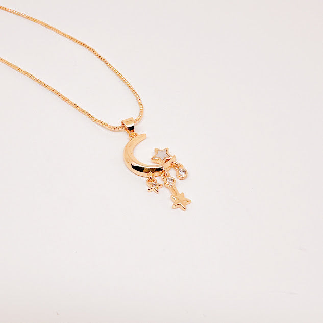Collar de acero inoxidable de color dorado con dije en forma de Luna adornado con pequeñas estrellas colgantes. Ideal para añadir un toque de mistico a tu atuendo diario.