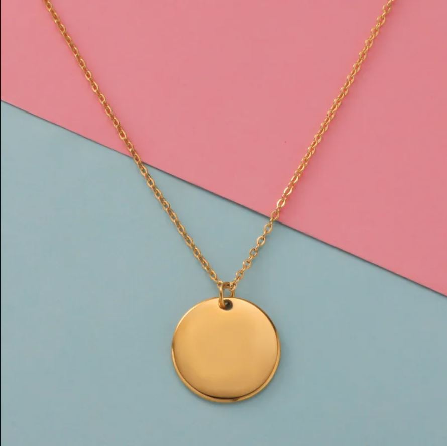 Lleva contigo un pedazo de eternidad con esta delicada plaquita redonda de acero inoxidable. Con sus 2cm de diámetro, es el tamaño perfecto para grabar un nombre, fecha o mensaje que toque tu corazón.