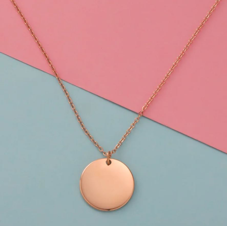 Lleva contigo un pedazo de eternidad con esta delicada plaquita redonda de acero inoxidable. Con sus 2cm de diámetro, es el tamaño perfecto para grabar un nombre, fecha o mensaje que toque tu corazón.