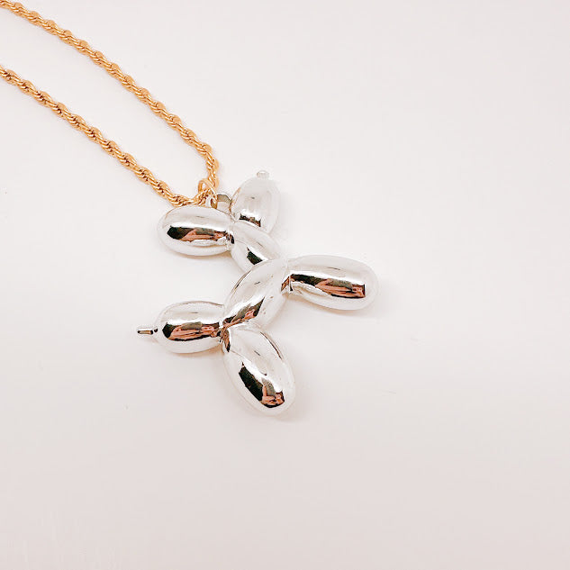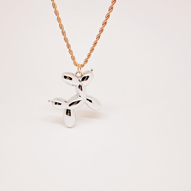 Collar de acero inoxidable y plastimetal con dije en forma de perrito de globo en color plateado y cadena en color dorado. Perfecto para añadir un toque de diversión y ternura a tu look.