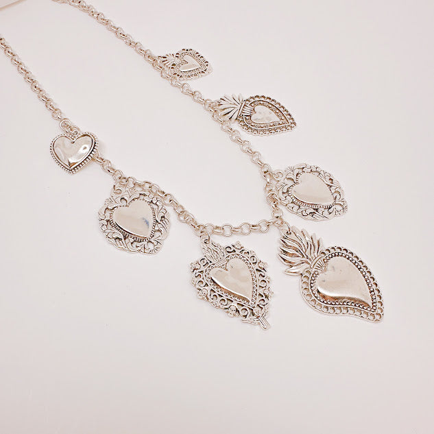 Collar de acero inoxidable de Sagrado corazon, en color plateado, con multiples corazones que resaltan su simbolismo. Luce increible con este collar que combina elegancia y espiritualidad.