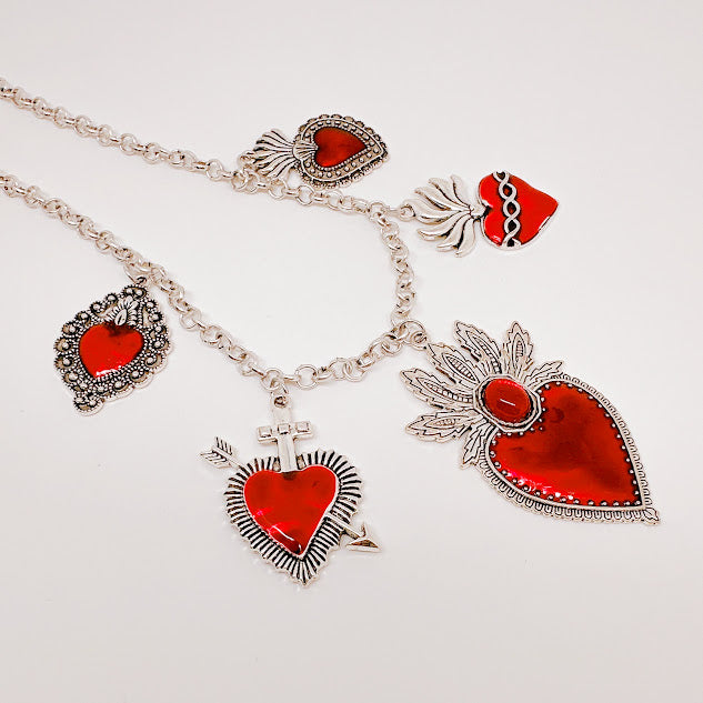 Collar de acero inoxidable de Sagrado corazon, en color plateado con rojo, con multiples corazones que resaltan su simbolismo. Luce increible con este collar que combina elegancia y espiritualidad.