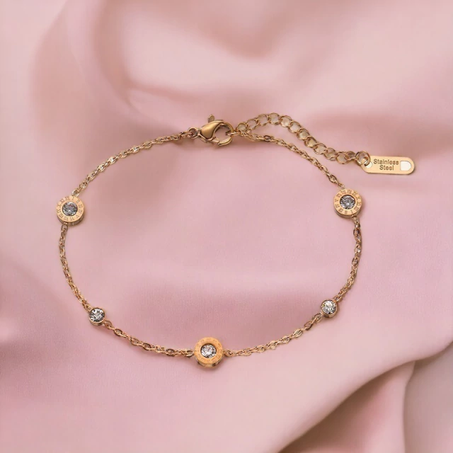 Pulsera elegante minimalista dorada con círculos con diamantes incrustados, acero titanio