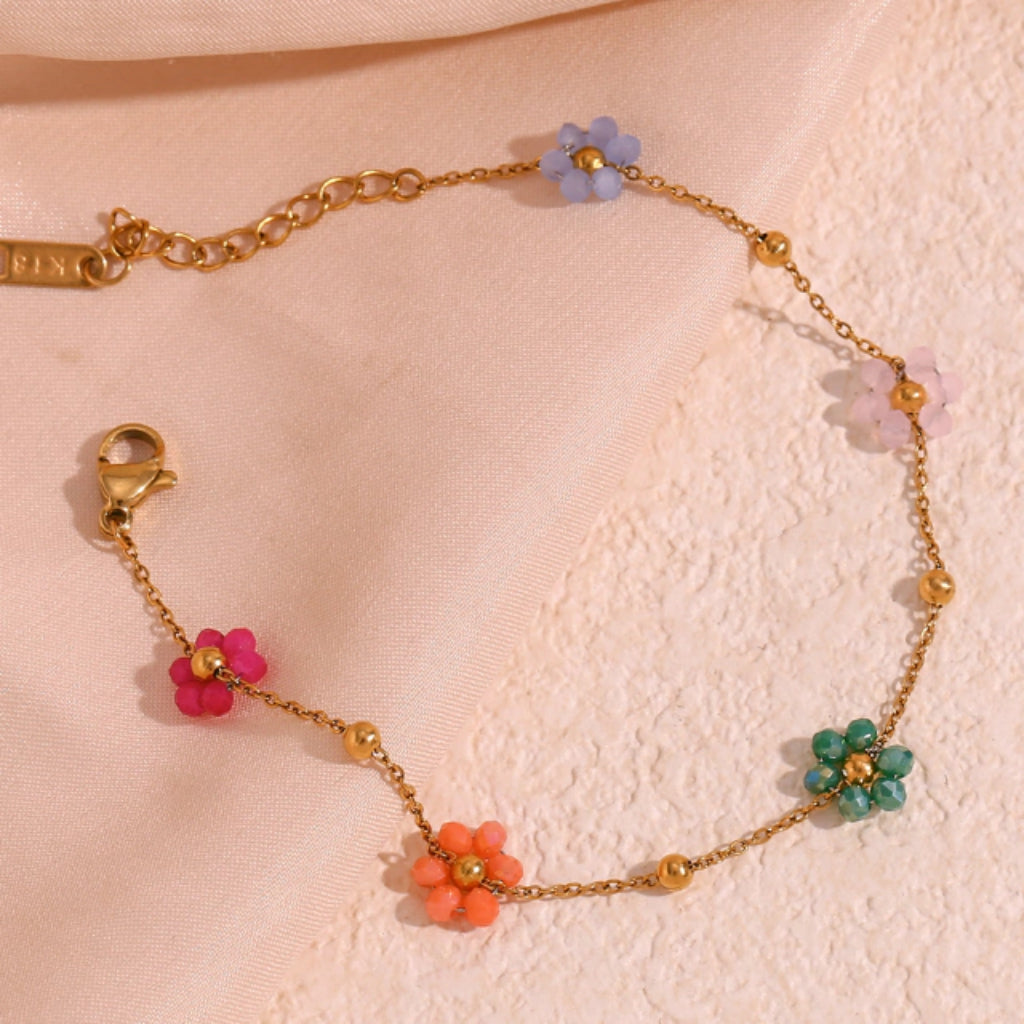 Pulsera de flores de colores con cadena dorada acero inoxidable.