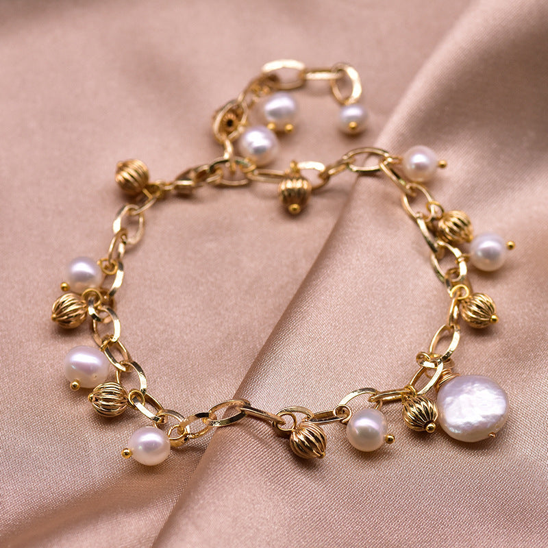 Pulsera de chapa de oro dorada adornada con perlas y detalles circulares. Usala para una ocasión especial o para resaltar tu look diario.